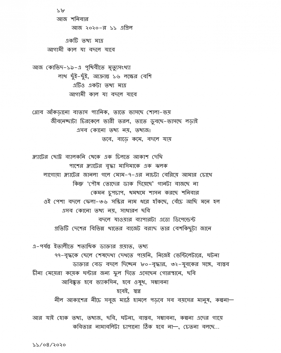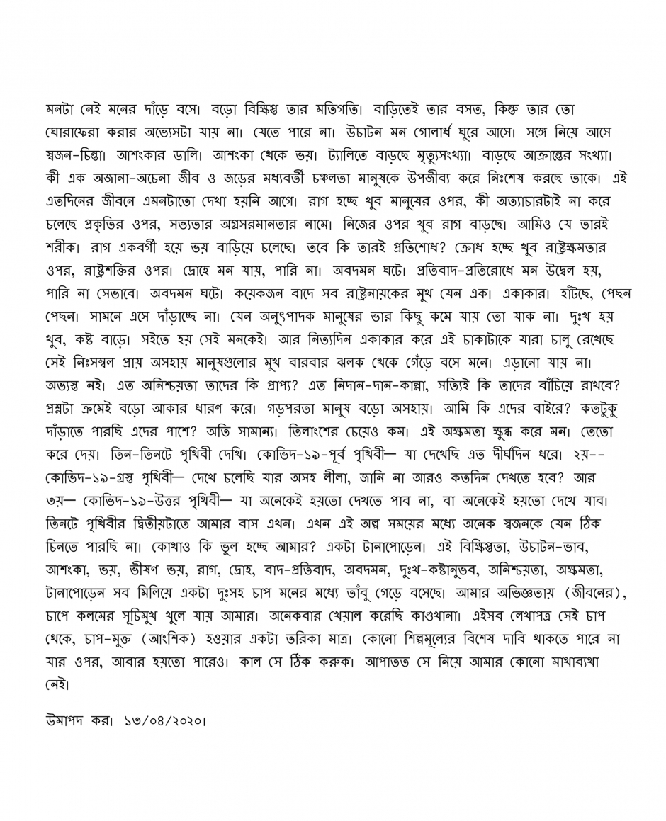 মনটা নেই মনের দাঁড়ে বসে। বড়ো বিক্ষিপ্ত তার মতিগতি। বাড়িতেই তার বসত, কিন্তু তার তো ঘোরাফেরা করার অভ্যেসটা যায় না। যেতে পারে না। উচাটন মন গোলার্ধ ঘুরে আসে। সঙ্গে নিয়ে আসে স্বজন-চিন্ঠা। আশংকার ডালি। আশংকা থেকে ভয়। ট্যালিতে বাড়ছে মৃত্যুসংখৠà¦¯à¦¾à¥¤ বাড়ছে à¦†à¦•à§à¦°à¦¾à¦¨à§à¦¤à§‡à ° সংখ্যা। কী এক অজানা-à¦…à¦šà§‡à¦¨à ¦¾ জীব ও জড়ের মধ্যবর্তী চঞ্চলতা মানুষকে উপজীব্য করে নিঃশেষ করছে তাকে। এই এতদিনের জীবনে এমনটাতো দেখা হয়নি আগে। রাগ হচ্ছে খুব মানুষের ওপর, কী অত্যাচারটঠই না করে চলেছে প্রকৃতির ওপর, সভ্যতার অগ্রসরমানঠ¤à¦¾à¦° নামে। নিজের ওপর খুব রাগ বাড়ছে। আমিও যে তারই শরীক। রাগ একবর্গী হয়ে ভয় বাড়িয়ে চলেছে। তবে কি তারই প্রতিশোধ? ক্রোধ হচ্ছে খুব রাষ্ট্রক্ঠমতার ওপর, রাষ্ট্রশকৠতির ওপর। দ্রোহে মন যায়, পারি না। অবদমন ঘটে। প্রতিবাদ-পৠরতিরোধে মন উদ্বেল হয়, পারি না সেভাবে। অবদমন ঘটে। কয়েকজন বাদে সব রাষ্ট্রনায় কের মুখ যেন এক। একাকার। হাঁটছে, পেছন পেছন। সামনে এসে দাঁড়াচ্ছে না। যেন অনুৎপাদক মানুষের ভার কিছু কমে যায় তো যাক না। দুঃখ হয় খুব, কষ্ট বাড়ে। সইতে হয় সেই মনকেই। আর নিত্যদিন একাকার করে এই চাকাটাকে যারা চালু রেখেছে সেই নিঃসম্বল প্রায় অসহায় মানুষগুলোঠ° মুখ বারবার ঝলক থেকে গেঁড়ে বসে মনে। এড়ানো যায় না। অভ্যস্ত নই। এত অনিশ্চয়তা তাদের কি প্রাপ্য? এত নিদান-দান-à¦•à ¾à¦¨à§à¦¨à¦¾, সত্যিই কি তাদের বাঁচিয়ে রাখবে? প্রশ্নটা ক্রমেই বড়ো আকার ধারণ করে। গড়পরতা মানুষ বড়ো অসহায়। আমি কি এদের বাইরে? কতটুকু দাঁড়াতে পারছি এদের পাশে? অতি সামান্য। তিলাংশের চেয়েও কম। এই অক্ষমতা ক্ষুব্ধ করে মন। তেতো করে দেয়। তিন-তিনটে পৃথিবী দেখি। কোভিদ-১৯-পূ ¦°à§à¦¬ পৃথিবী— যা দেখেছি এত দীর্ঘদিন ধরে। ২য়-- কোভিদ-১৯-গ্ ¦°à¦¸à§à¦¤ পৃথিবী— দেখে চলেছি যার অসহ লীলা, জানি না আরও কতদিন দেখতে হবে? আর ৩য়— কোভিদ-১৯-উত §à¦¤à¦° পৃথিবী— যা অনেকেই হয়তো দেখতে পাব না, বা অনেকেই হয়তো দেখে যাব। তিনটে পৃথিবীর দ্বিতীয়টাঠে আমার বাস এখন। এখন এই অল্প সময়ের মধ্যে অনেক স্বজনকে যেন ঠিক চিনতে পারছি না। কোথাও কি ভুল হচ্ছে আমার? একটা টানাপোড়েনॠ¤ এই বিক্ষিপ্তঠা, উচাটন-ভাব, আশংকা, ভয়, ভীষণ ভয়, রাগ, দ্রোহ, বাদ-প্রতিবঠদ, অবদমন, দুঃখ-à¦•à¦·à§à¦Ÿà¦¾à ¨à§à¦­à¦¬, অনিশ্চয়তা, অক্ষমতা, টানাপোড়েন সব মিলিয়ে একটা দুঃসহ চাপ মনের মধ্যে তাঁবু গেড়ে বসেছে। আমার অভিজ্ঞতায় (জীবনের), চাপে কলমের সূচিমুখ খুলে যায় আমার। অনেকবার খেয়াল করেছি কাণ্ডখানাॠ¤ এইসব লেখাপত্র সেই চাপ থেকে, চাপ-মুক্ত (আংশিক) হওয়ার একটা তরিকা মাত্র। কোনো শিল্পমূল্ঠের বিশেষ দাবি থাকতে পারে না যার ওপর, আবার হয়তো পারেও। কাল সে ঠিক করুক। আপাতত সে নিয়ে আমার কোনো মাথ